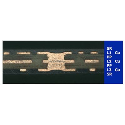 ビルドアップ構造のサブストレートです。当社では、ビルドアップ層に主にプリプレグを用いることで、高い寸法精度と優れた微細配線を実...