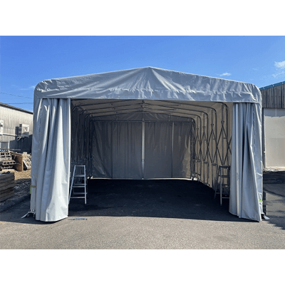 ■製品概要 マテハン伸縮テントは木材・建材を保管する簡易テントです。通常はブルーシート等で雨に濡れない様に養生等を行いますが、マ...