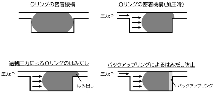 また、流体圧力が高くなると、その圧力によりオーリングが押し出され、はみだしによりシール機能が低下します。バックアップリングを使用することでオーリングのはみだしを防止することができ、流体圧力が6.9MPa以上ではバックアップリングを使用することが望ましいです。