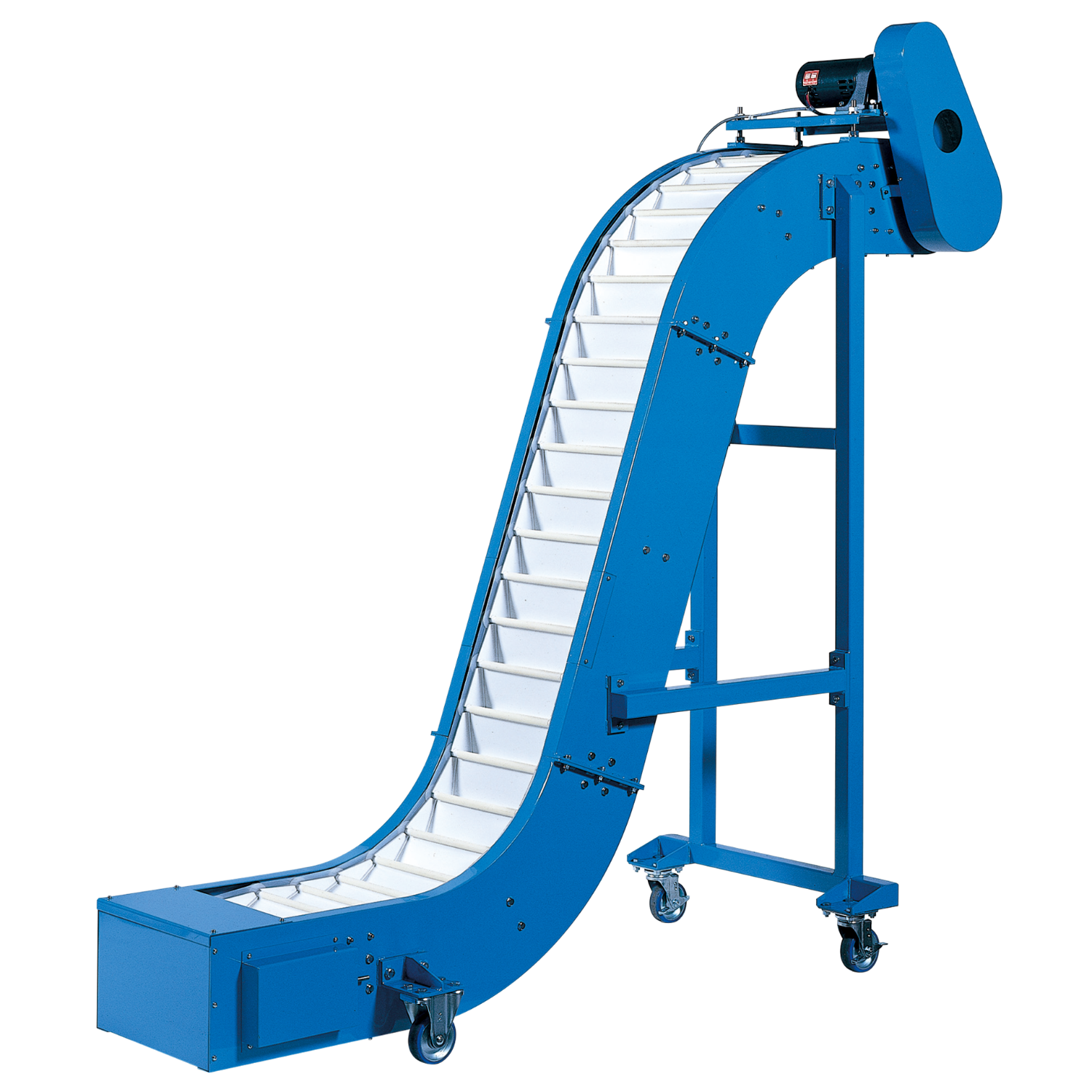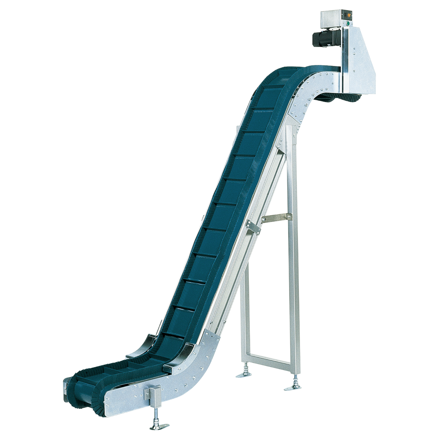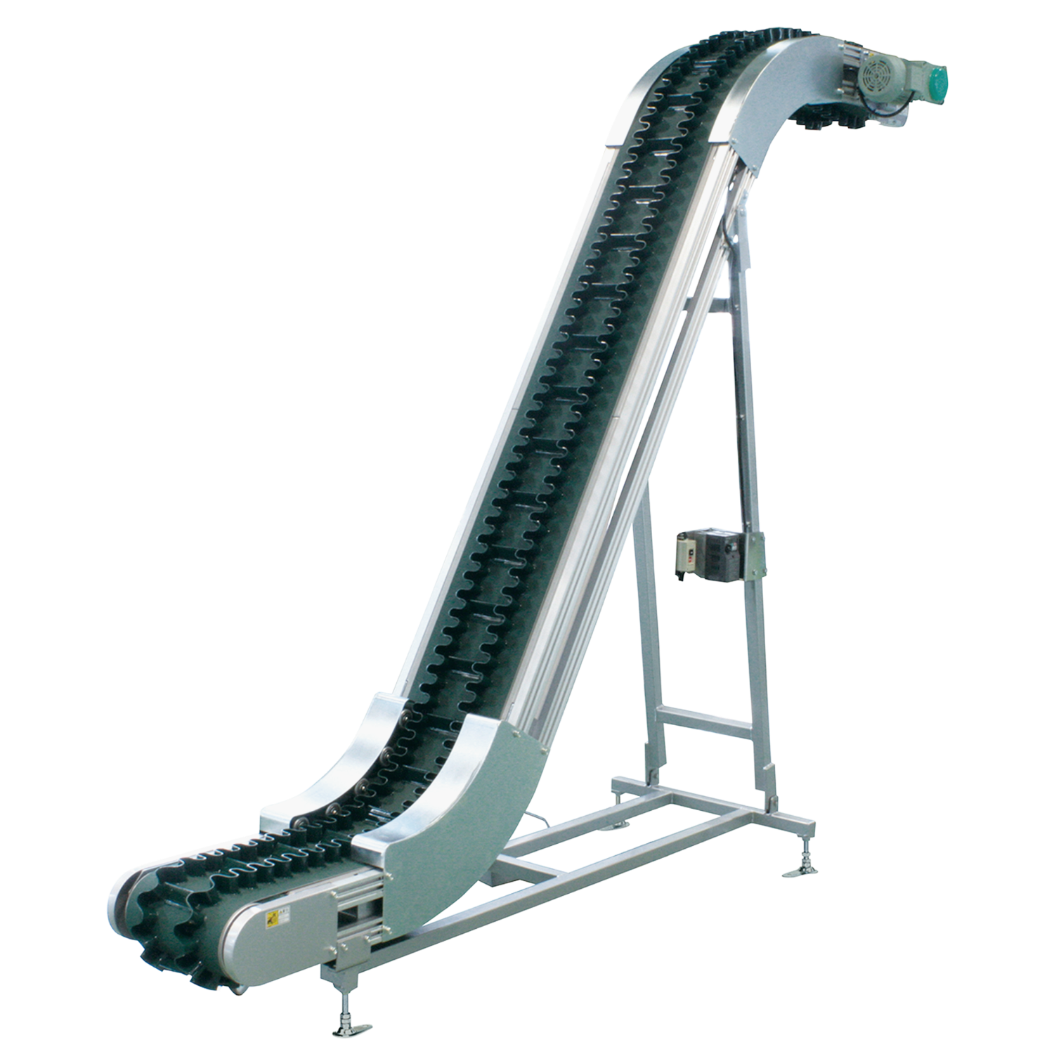 最大角度75°、最大揚程300cmまで可能な昇り傾斜搬送コンベヤ。 新発想のアンチバック式フックユニット構造で箱物からパウチなどの不定形...