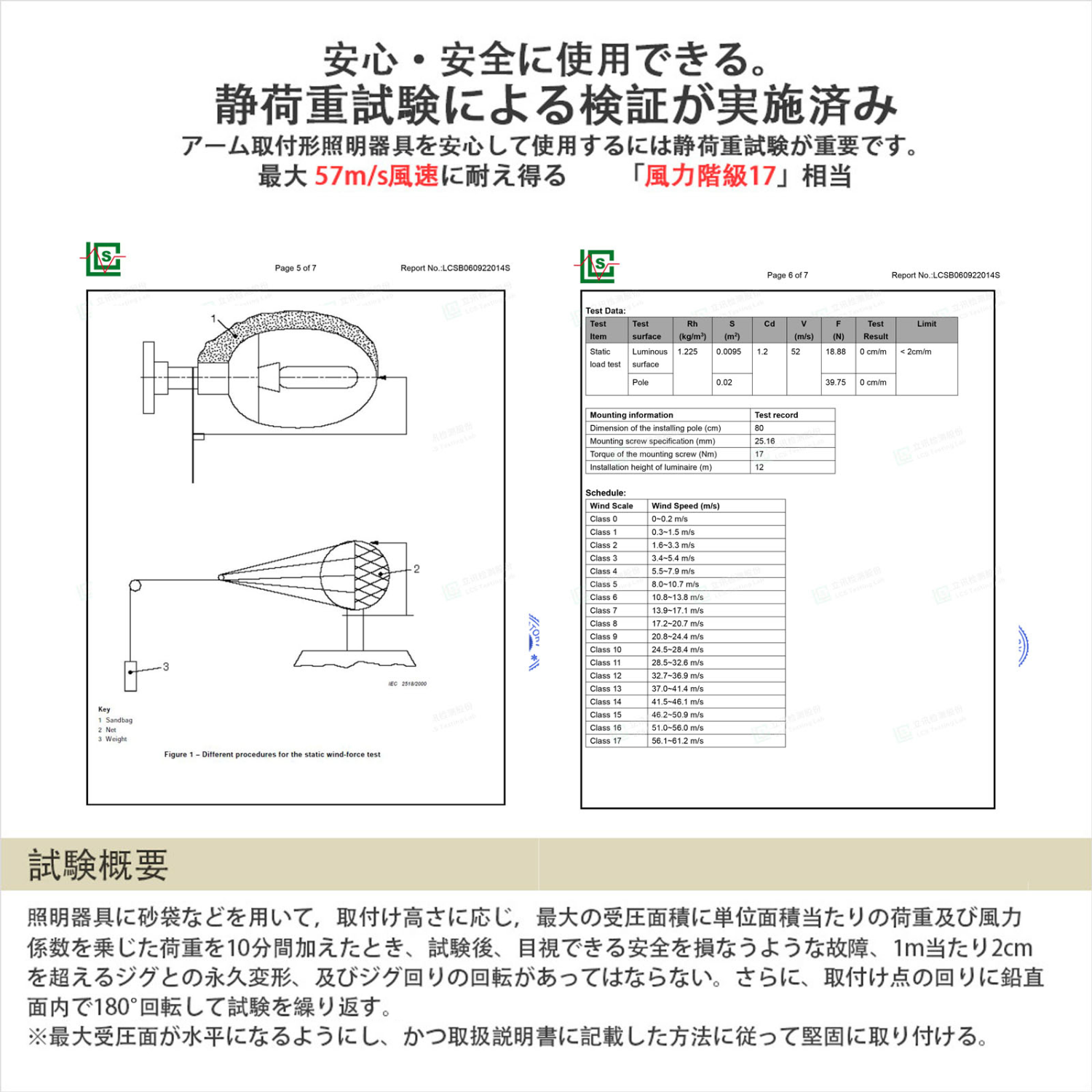 商品画像 | 品番 | 価格 (税抜) | 適合規格 | 効率 | 動作電圧 | 雷電サージ機能 | 電源ユニット | 明るさ | 演色性 | 色温度 | 照射角度 | 防水等級 | 電源ケーブル規格 | アームの長さ (ライト除く) | コードの長さ | 重さ | 本体色 | 材質 | セット内容 | ロット規格 ロット数 | ロット規格 質量 |