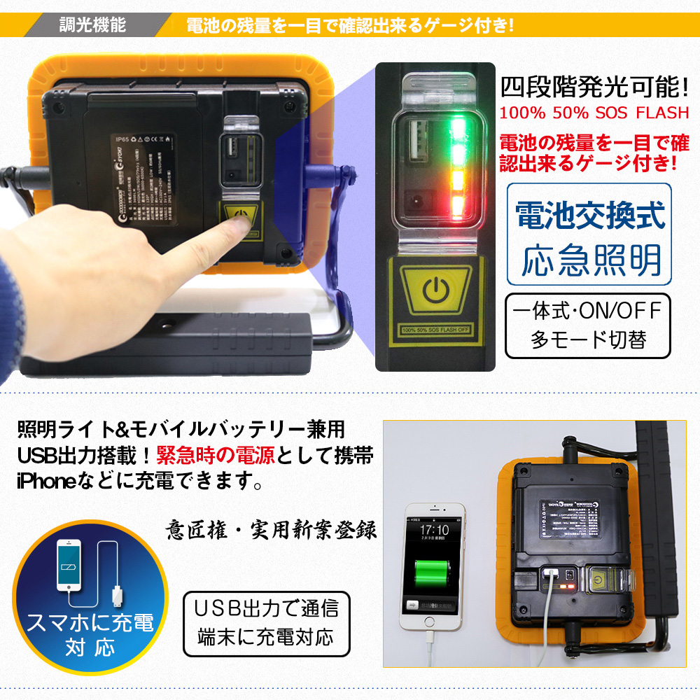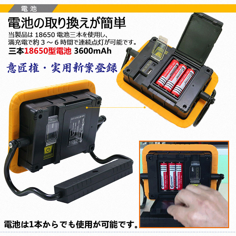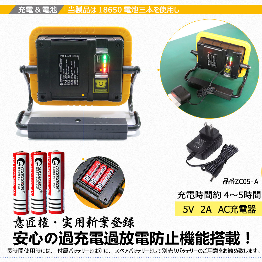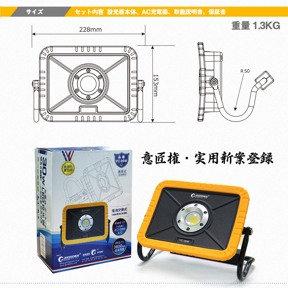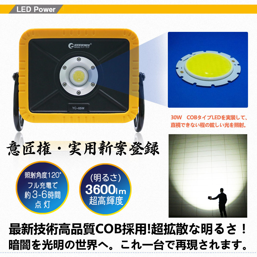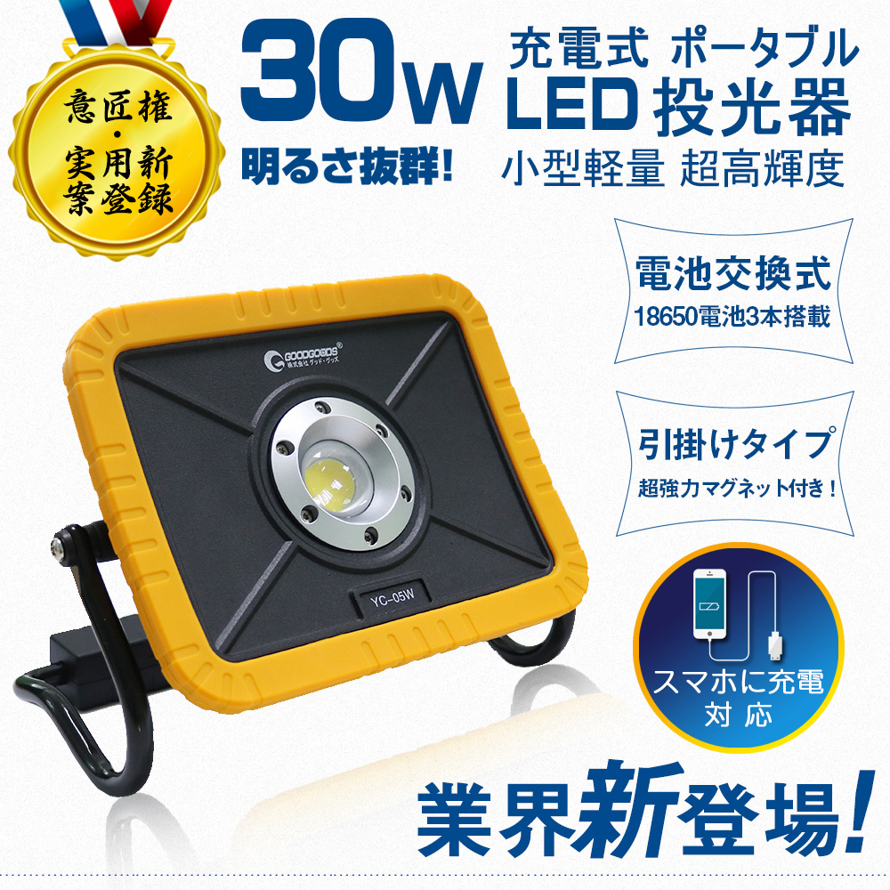 充電式投光器 バッテリー交換可 30W 意匠権 U字アーム マグネット付き YC-05W GOODGOODS グッドグッズ取扱企業