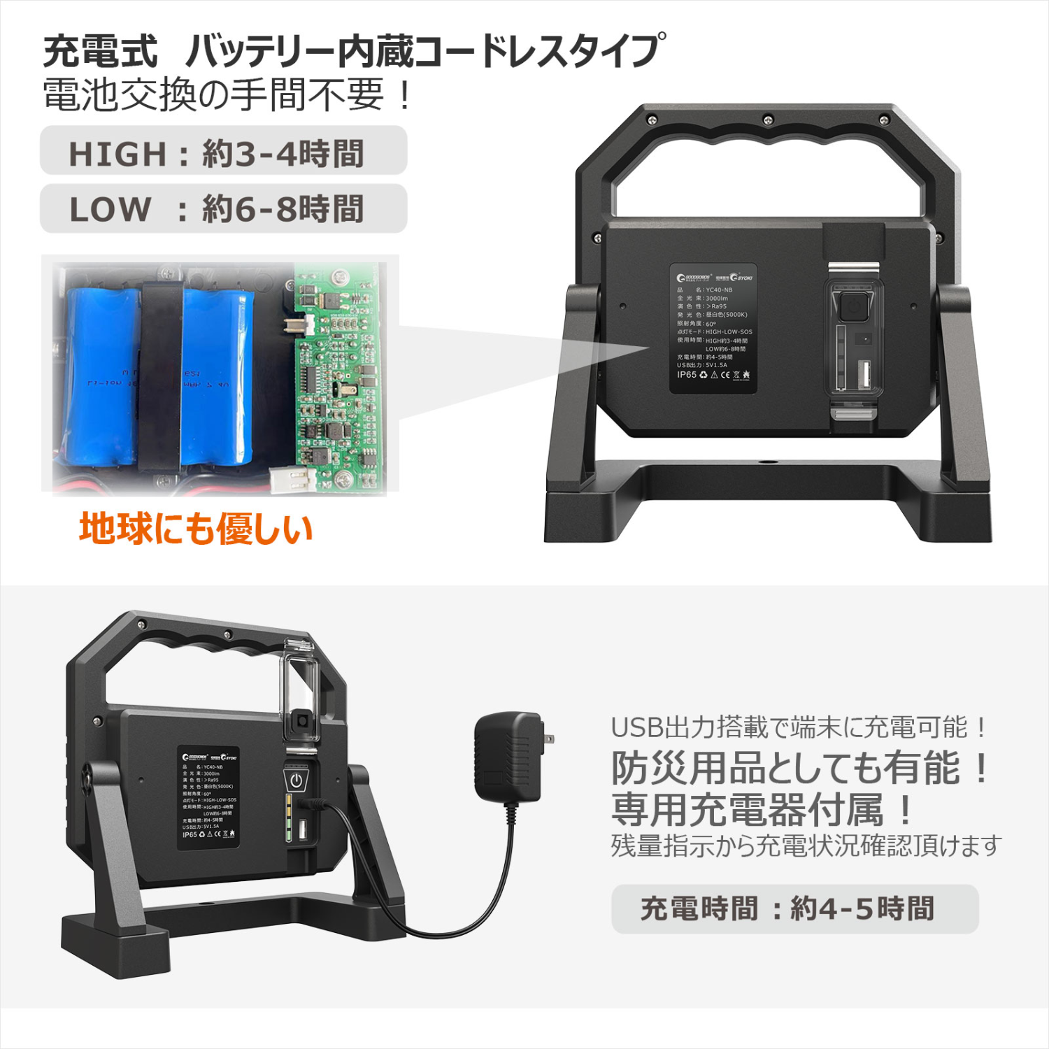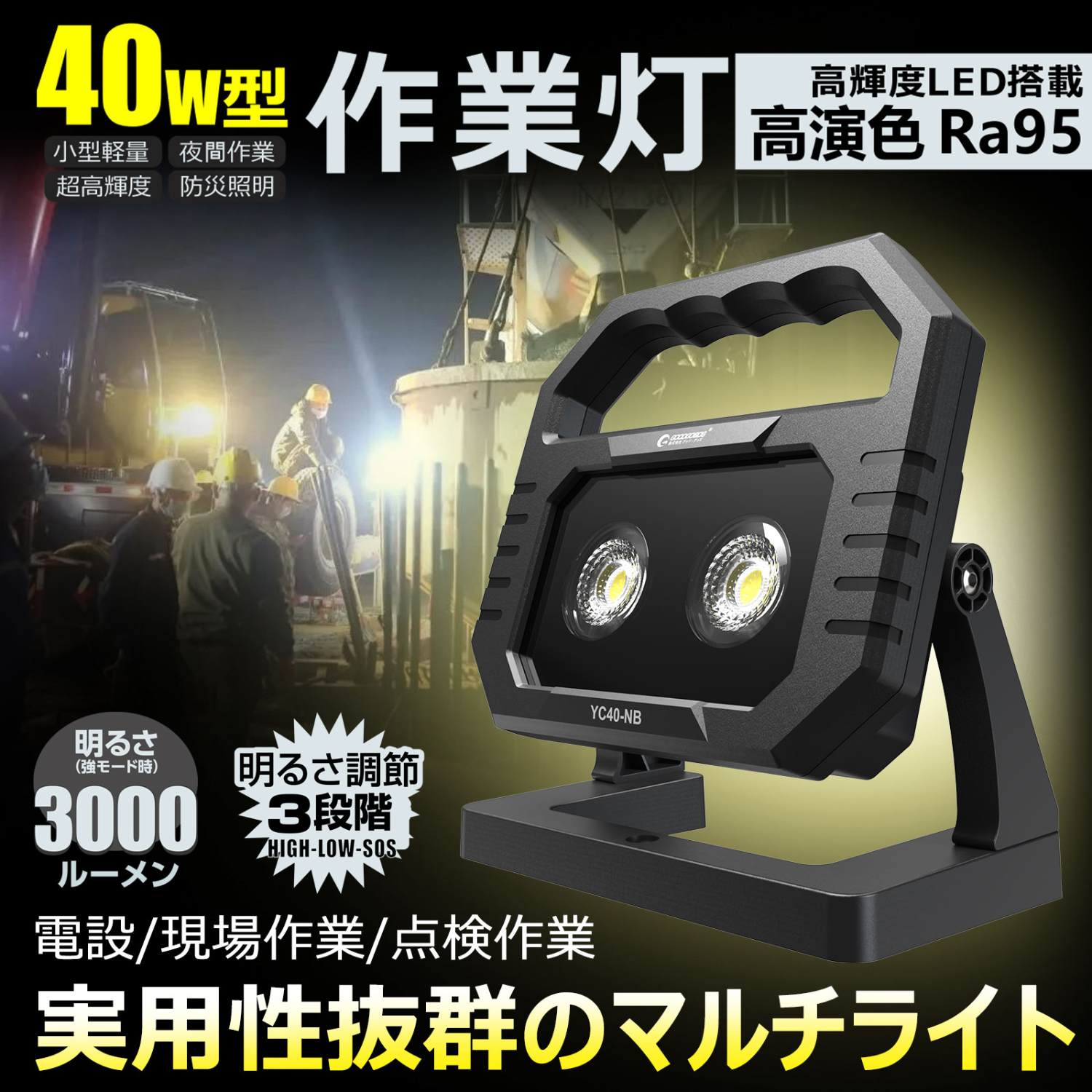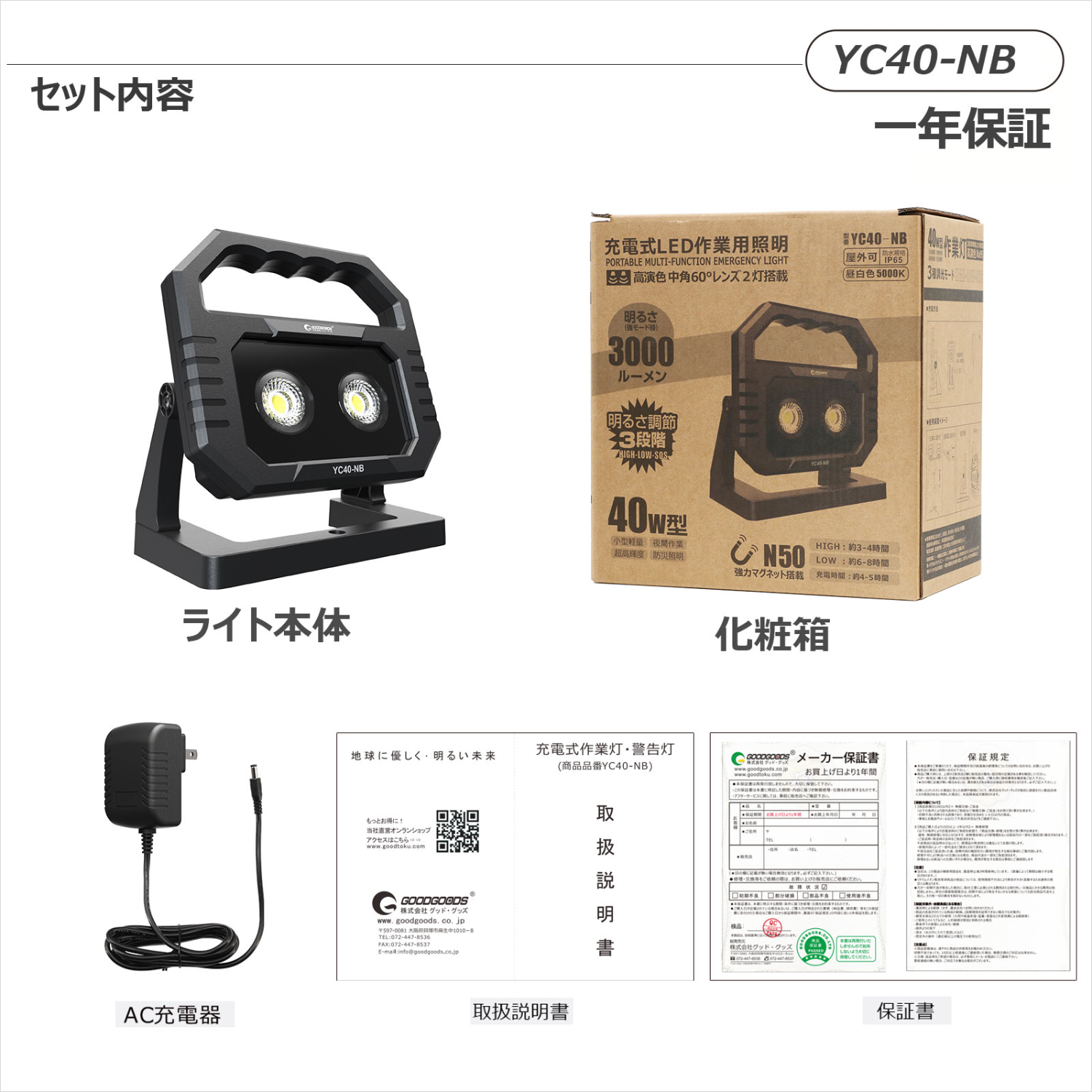 充電式投光器 高演色ライト 40w スタンド式 スタンド部強力マグネット内蔵 YC40-NB GOODGOODS グッドグッズ取扱企業