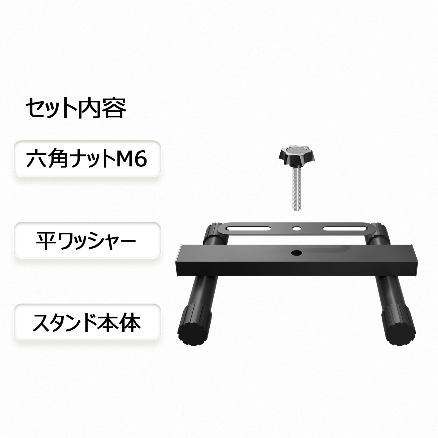 スタンド本体、M6ノブボルト、平ワッシャー |