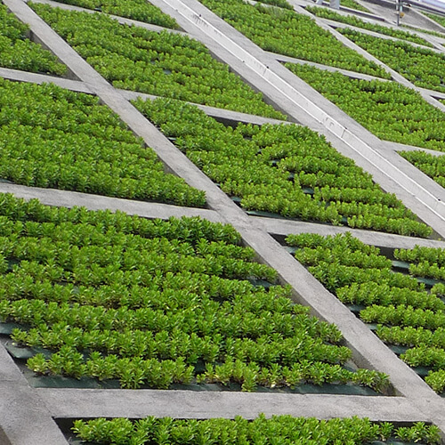 A3:常緑キリンソウ袋方式は、風速45mの風洞実験において飛散しないことを確認しています。ただし、超高層建物や特に風の強い地域・場所では、ハトメを利用して袋同士の連結、飛散防止ネットを併用する方法もございます。詳しくはお気軽にお問い合わせください。