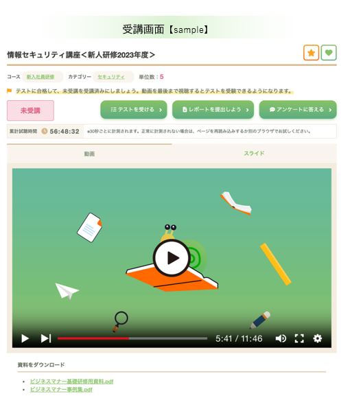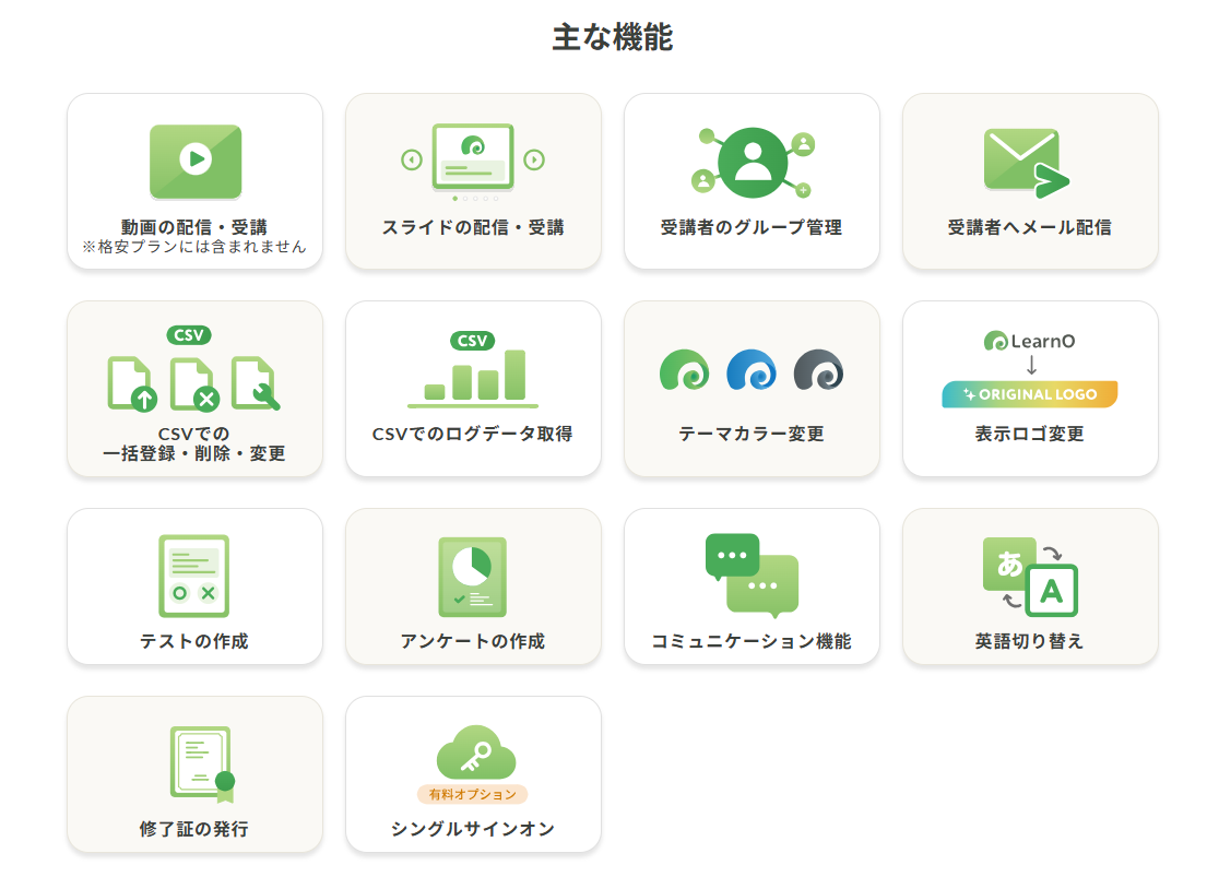 動画の配信・受講、スライドの配信・受講、テスト、組織管理、アンケート ※コンテンツ動画の提供はございません。 |