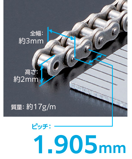 ピッチ:1.905、ローラ径:1.19、内リンク内幅:1.27 |