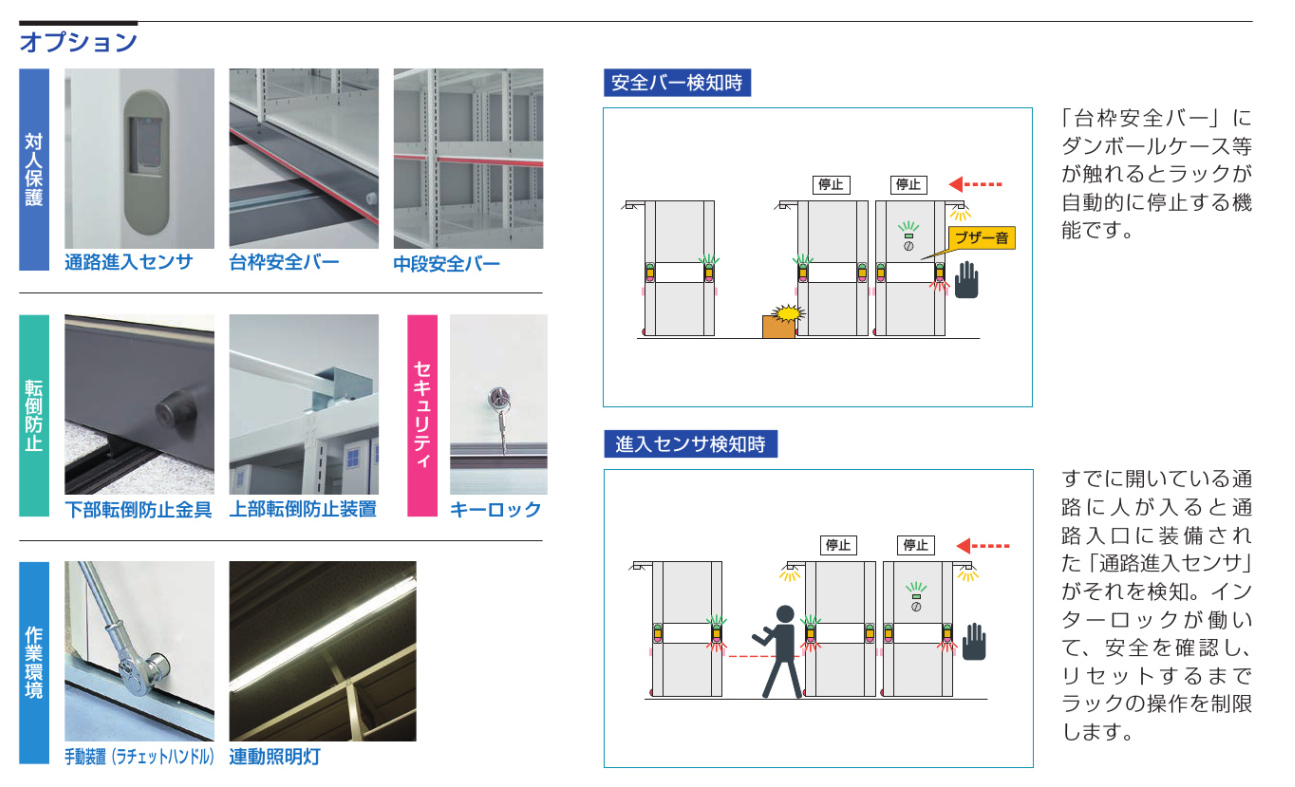 基本の安全設計は標準仕様に含まれています。通路進入センサや安全バーなどの能動的安全装置はオプションで追加可能です。オプションにつきましては添付画像をご参照ください。