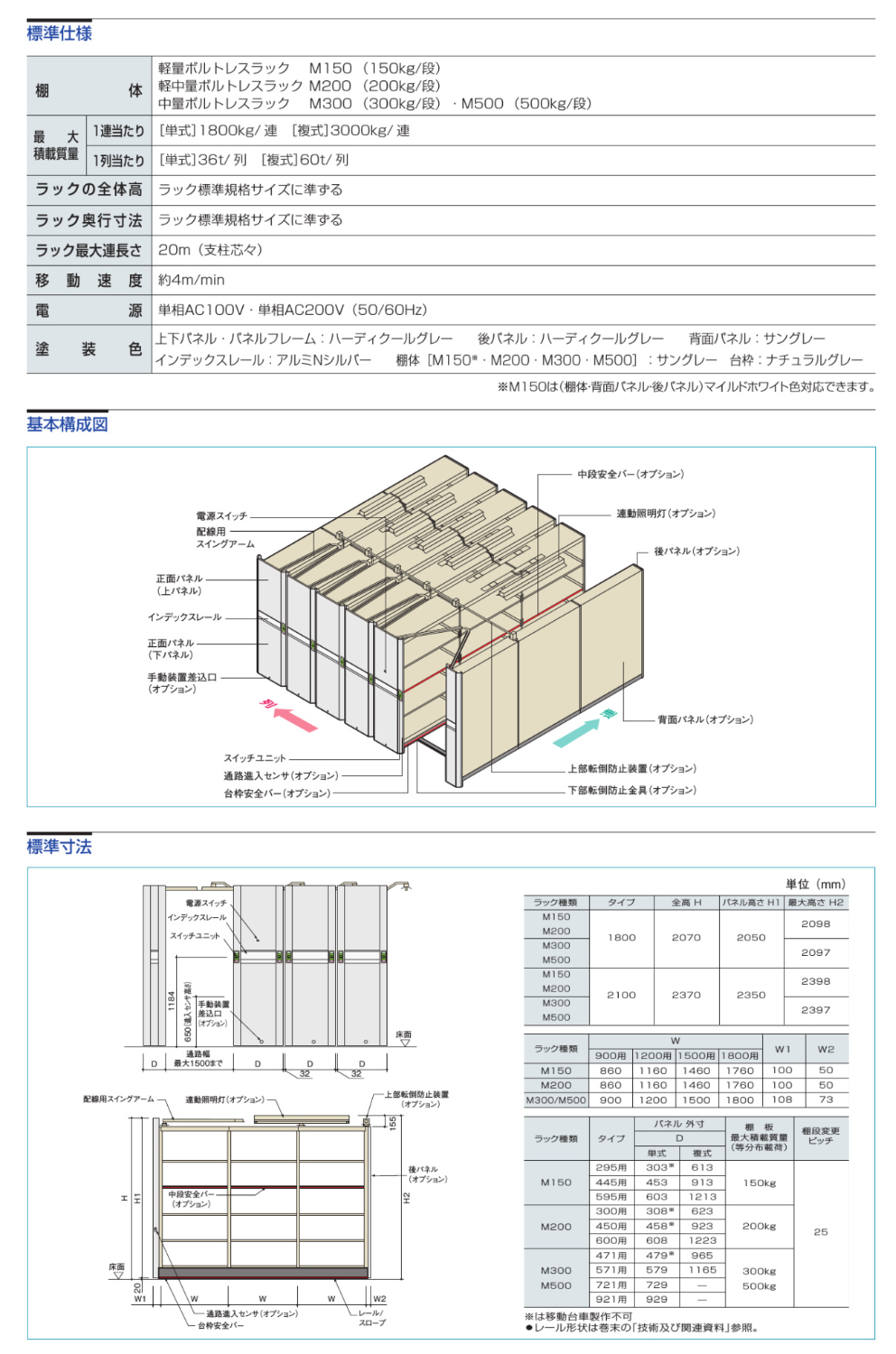 対応棚体(M150/M200/M300/M500)での導入は可能です。ただし、既設レイアウト(通路幅・柱位置・床構造)、連長、電源条件によって制約が生じるため、設置前に現場条件と仕様の適合確認が必要です。