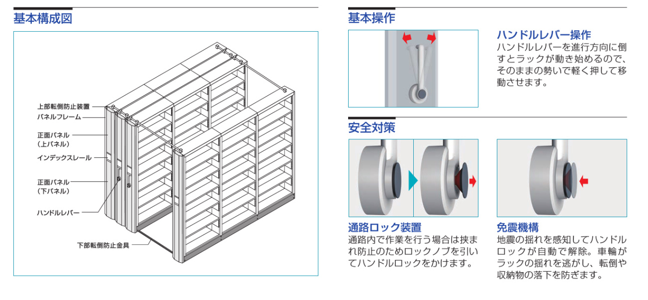 通路ロック装置と免震機構を搭載しています。地震の揺れを感知するとハンドルロックが自動解除され、車輪が揺れを逃がすことで転倒や収納物の落下を防ぎます。