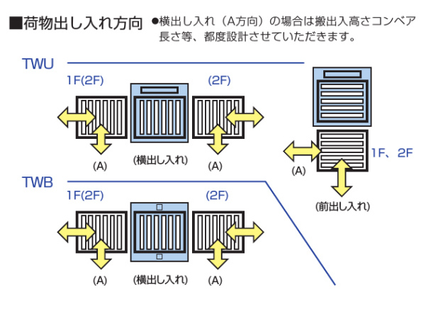 最大6間口(片側3)まで対応可能です。搬送方向は同面・両面・Z型から選べます。