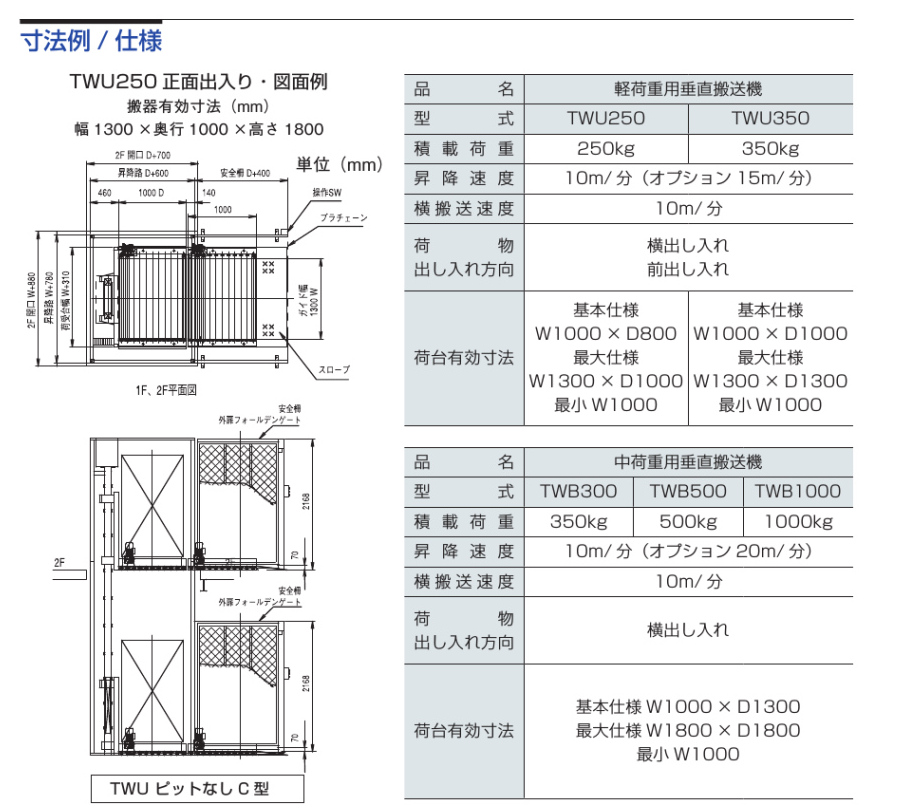 軽荷重用(250〜350kg)と中荷重用(350〜1000kg)の型式があり、荷台寸法も仕様に応じて選定可能です。