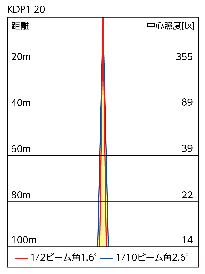 |   | KDP1-20 | 要見積もり | 82×108×94mm | 980g (ブラケット含む) | 20W | 白 | 1.6° | 2.6° | DC 24V | DC 12.5V~70V | 156lm | 20,000~50,000h | 8.6Grms | 100% | -30~40℃ | 無し (調光不可) |