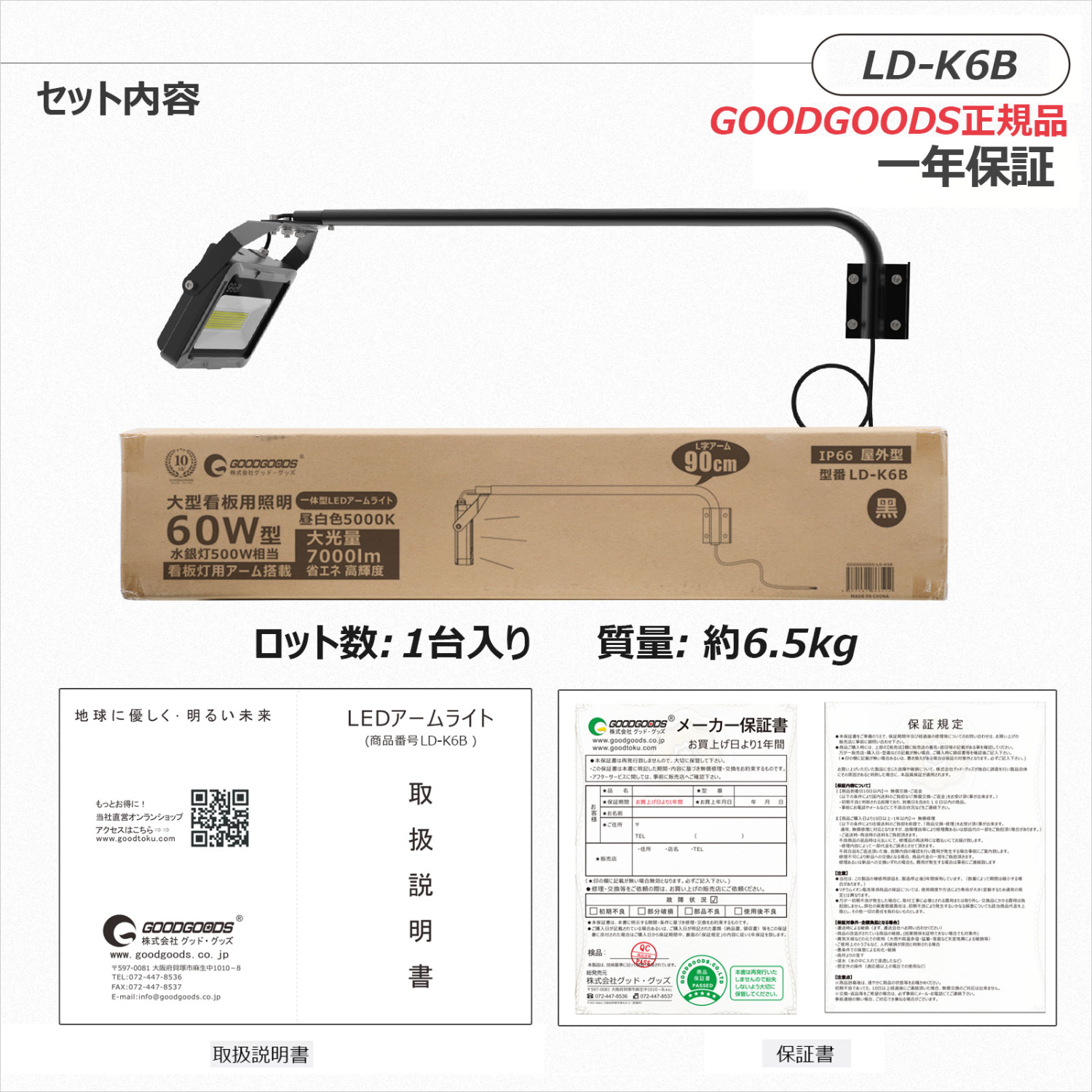 灯具+L字アーム*1セット、取扱説明書、保証書 |