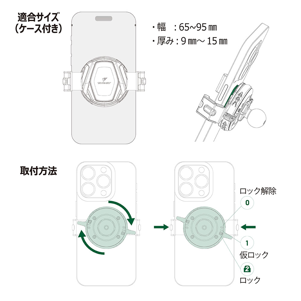 ①は仮ロック状態のため、そのまま走行を行わないでください。走行時は必ずロックを②まで回し、しっかりとロックした状態でご使用ください。