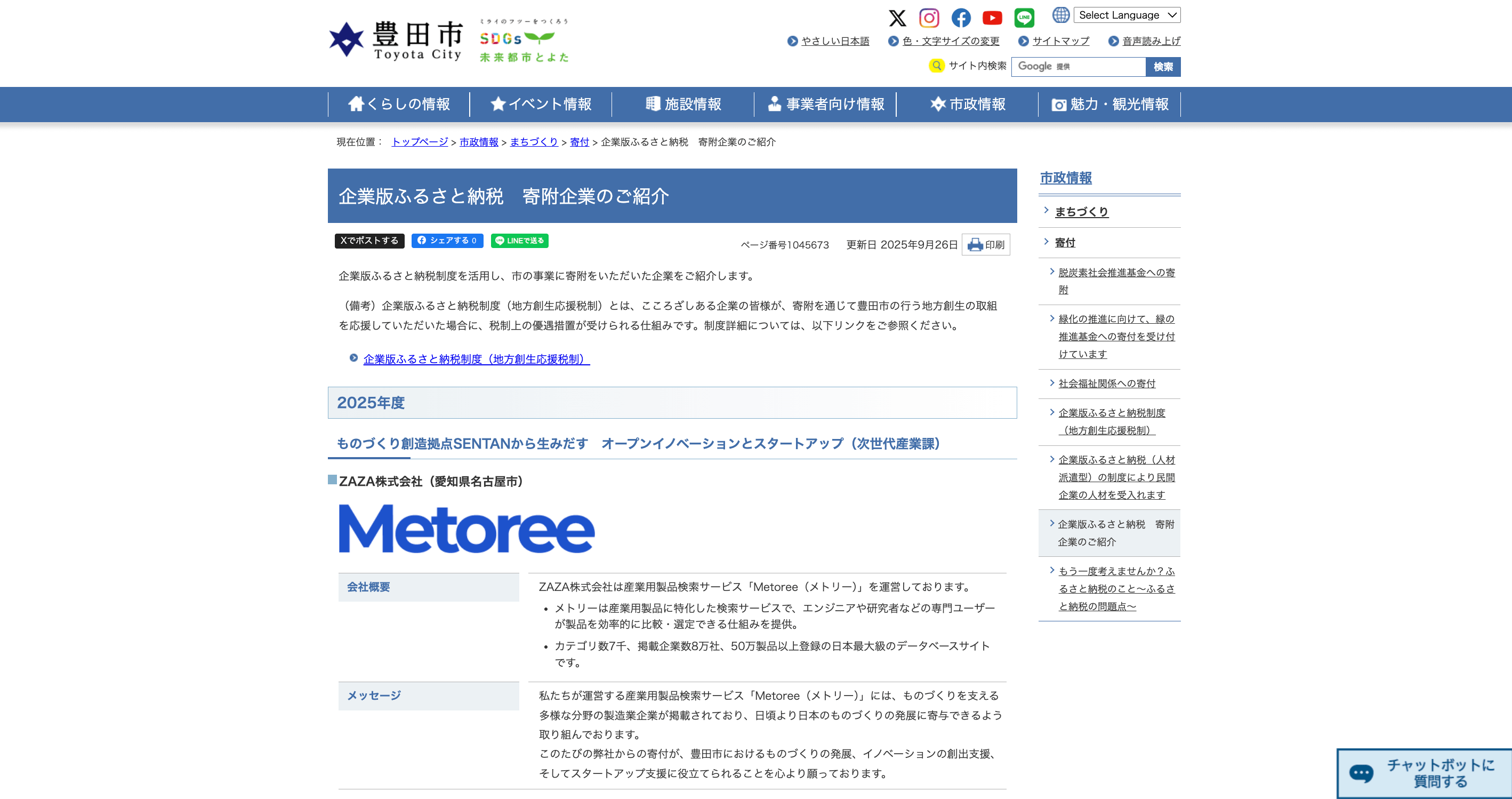 産業⽤製品検索サイト「メトリー」、愛知県豊⽥市の企業版ふるさと納税を活⽤し「ものづくり創造拠点SENTAN」事業へ寄附を実施。