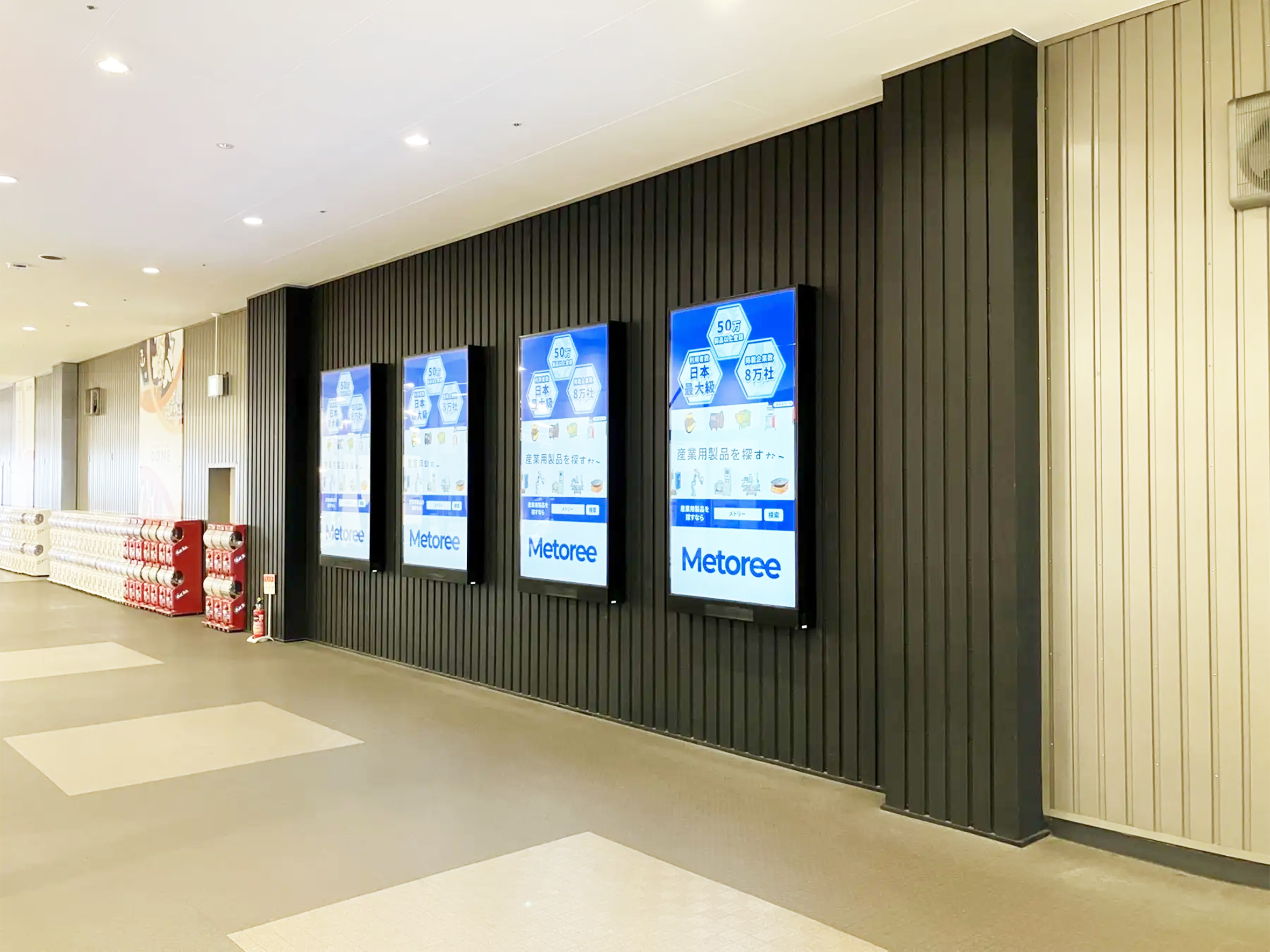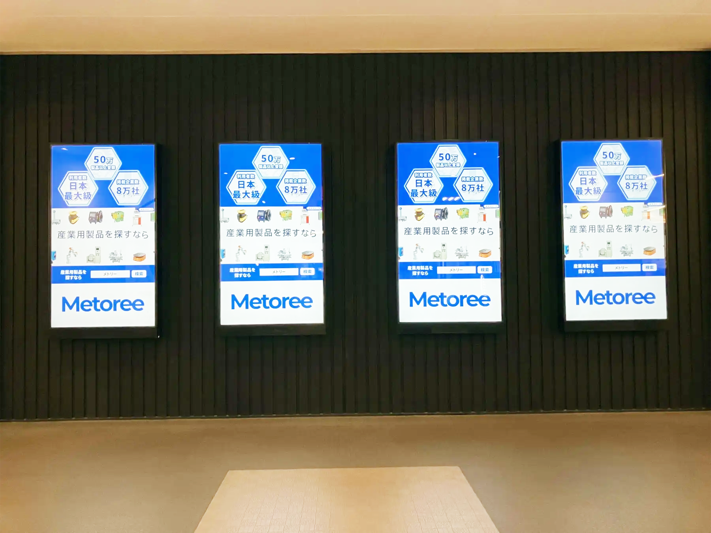 サイネージ広告では、「産業用製品を探すなら」というキャッチフレーズとともに、50万点を超える製品掲載数、8万社以上の登録企業、そして国内最大級の利用者数を誇るメトリーの特徴を訴求し、利便性と信頼性を広く伝えています。